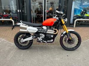 The Scrambler 1200 XE is engaging and responsive to ride with its class leading off-road capability. The Scrambler 1200 XE utilises the iconic high-torque twin that delivers a captivating experience with its deep-thumping exhaust note and thrilling power delivery. Its class leading brakes and suspension, combined with a commanding riding position this means the Scrambler 1200 XE is a capable mile muncher, no matter the terrain or environment. The Scrambler 1200 XE has a class-leading specification including TFT screen, hand guards and Ohlin's Rear suspension. The wide range of genuine Triumph accessories available can further enhance the look and experience including luggage options, additional protection and much more.